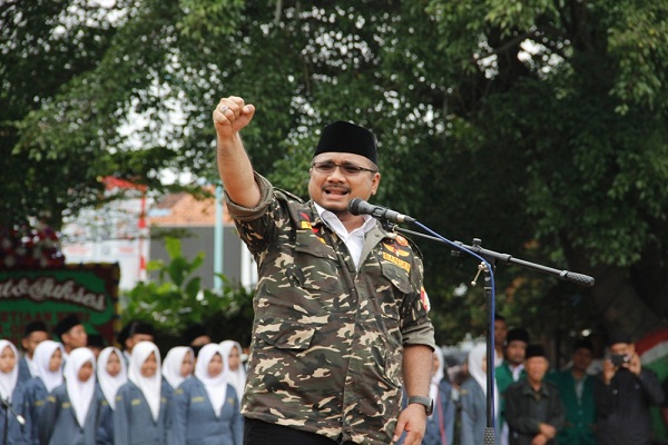 “Pada kesempatan ini saya akan menyampaikan empat karakter yang harus dimiliki anggota Banser,” katanya memulai orasi.