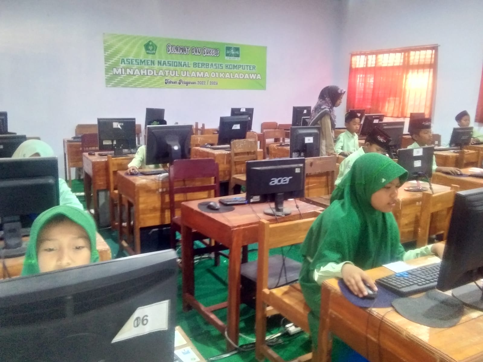 Pelaksanaan Asesmen Nasional Berbasis Komputer (ANBK) di Madrasah Ibtidaiyah Nahdlatul Ulama (MI NU) 01 Desa Kaladawa Kec. Talang Kab. Tegal di sambut antusias siswa-siswinya.